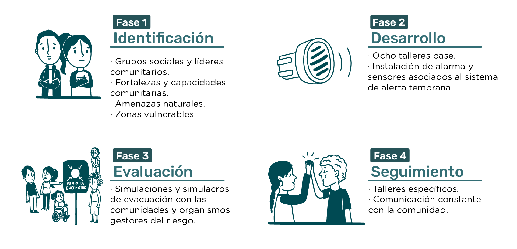 Además, promueven la educación y la comprensión de los riesgos, empoderando a las comunidades para que estén preparadas y tomen medidas preventivas. Para este proceso, se aborda una metodología constructivista, basada en el contexto y el aprendizaje experiencial mediante un trabajo transdisciplinario, que permite generar procesos dialógicos, donde el conocimiento científico y comunitario se articulan para que los ciudadanos actúen como gestores del riesgo de desastres en su territorio. La estrategia comprende cuatro fases (Figura 4), en las que se desarrollan diversas actividades con el fin de dejar capacidades instaladas en las comunidades para responder de manera asertiva ante la posible ocurrencia de una emergencia.