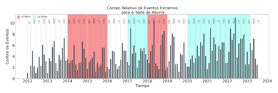 El Valle de Aburrá cambia rápidamente de temporadas lluviosas a secas, lo que genera la necesidad de un monitoreo holístico de los eventos extremos de precipitación en sus colas probabilísticas según características asociadas a la intensidad, acumulado, duración, y la existencia de rachas de sequía. No obstante, el estudio de eventos de precipitación extremos requiere un análisis que va más allá de comprender las temporadas secas o lluviosas. En la Figura 1 se presenta el número de ocurrencias estandarizadas por cantidad de estaciones de eventos de precipitación extremos a lo largo de la historia de la red pluviométrica del AMVA desde 2012.