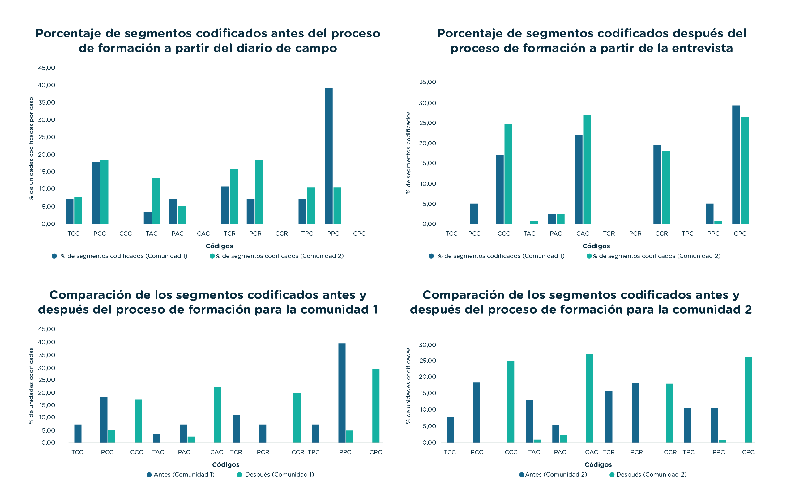 Tras el proceso formativo, la comunidad 1 mostró un cambio significativo (dimensión Crítica). La líder destacó la importancia de los talleres para fomentar la organización comunitaria y valoró la profesionalidad del equipo del proyecto.