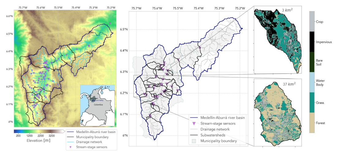 El Valle de Aburrá es una subregión de Antioquia ubicada en los Andes colombianos. Se caracteriza por ser un terreno montañoso con la presencia del río Aburrá-Medellín que recorre el territorio de sur a norte. Sus condiciones lo convierten en un lugar complejo con riesgos asociados a las condiciones hidrometeorológicas y geofísicas del territorio. Antioquia tiene un área de 63,612 km2 y el Valle de Aburrá de 1,152 km2. A partir de los datos del Censo Nacional del DANE de 2018 [1], las proyecciones del Departamento Nacional de Planeación de 2023 [2] indican que siete de cada diez personas que viven en Antioquia residen en el Valle de Aburrá, donde se concentra una población de aproximadamente 4.2 millones de personas. Este valle estrecho está cubierto por 812 km2 de suelo rural, lo que equivale al 70%, y 340 km2 de suelo urbano, correspondiente al 30% restante. El 95.4% de la población que habita este territorio vive en suelo urbano [2], lo que hace que las condiciones de vulnerabilidad de sus habitantes sean mayores dada la densidad poblacional.