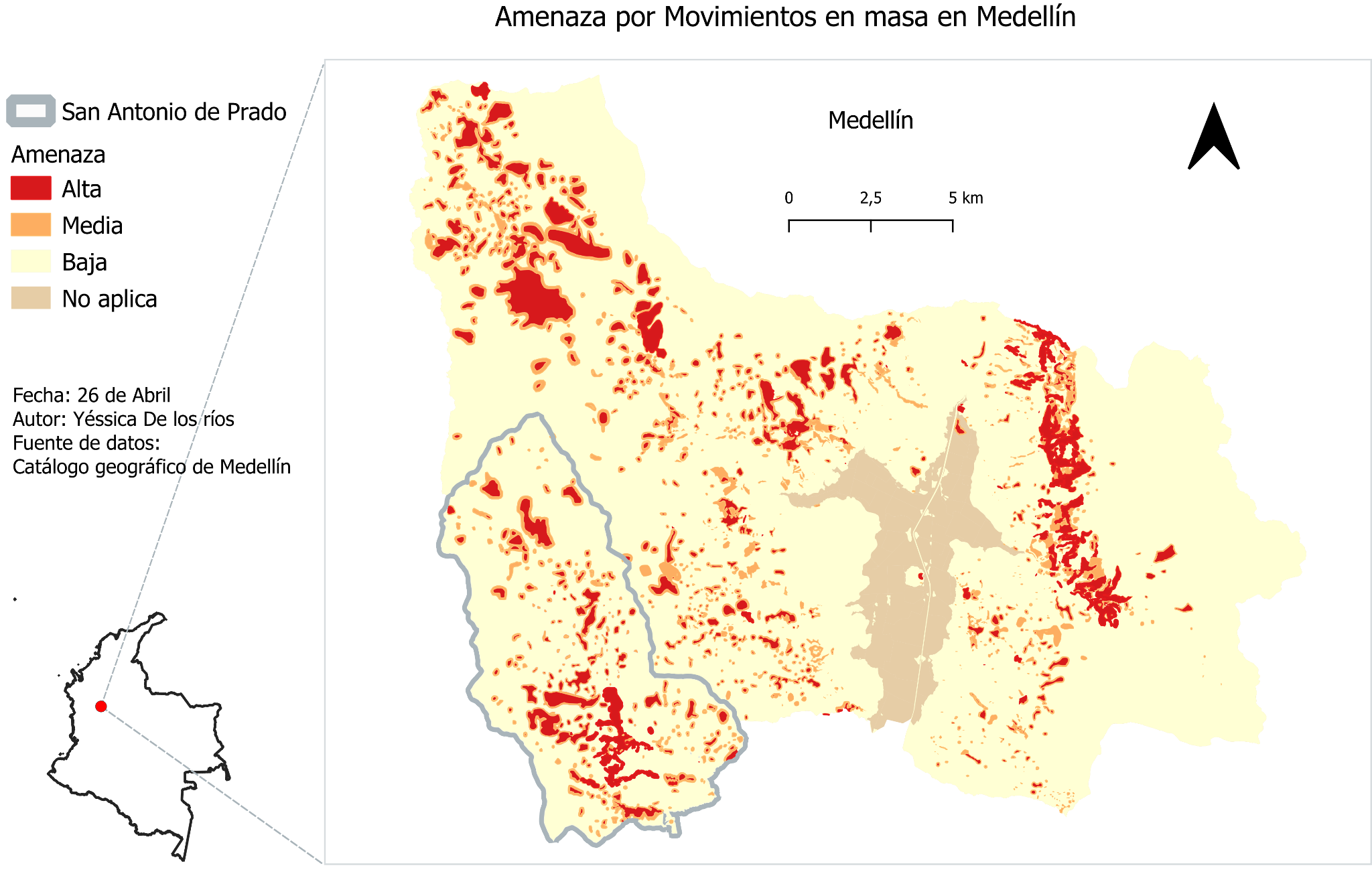 San Antonio de Prado es un corregimiento municipal (división rural de un municipio) ubicado al suroccidente de la ciudad de Medellín, caracterizado por frecuentes reportes de amenazas naturales [12–16]. Recientemente, el Departamento Administrativo de Gestión del Riesgo (DAGRD) lo ha reconocido como uno de los sectores de la ciudad con alta vulnerabilidad a deslizamientos [17].