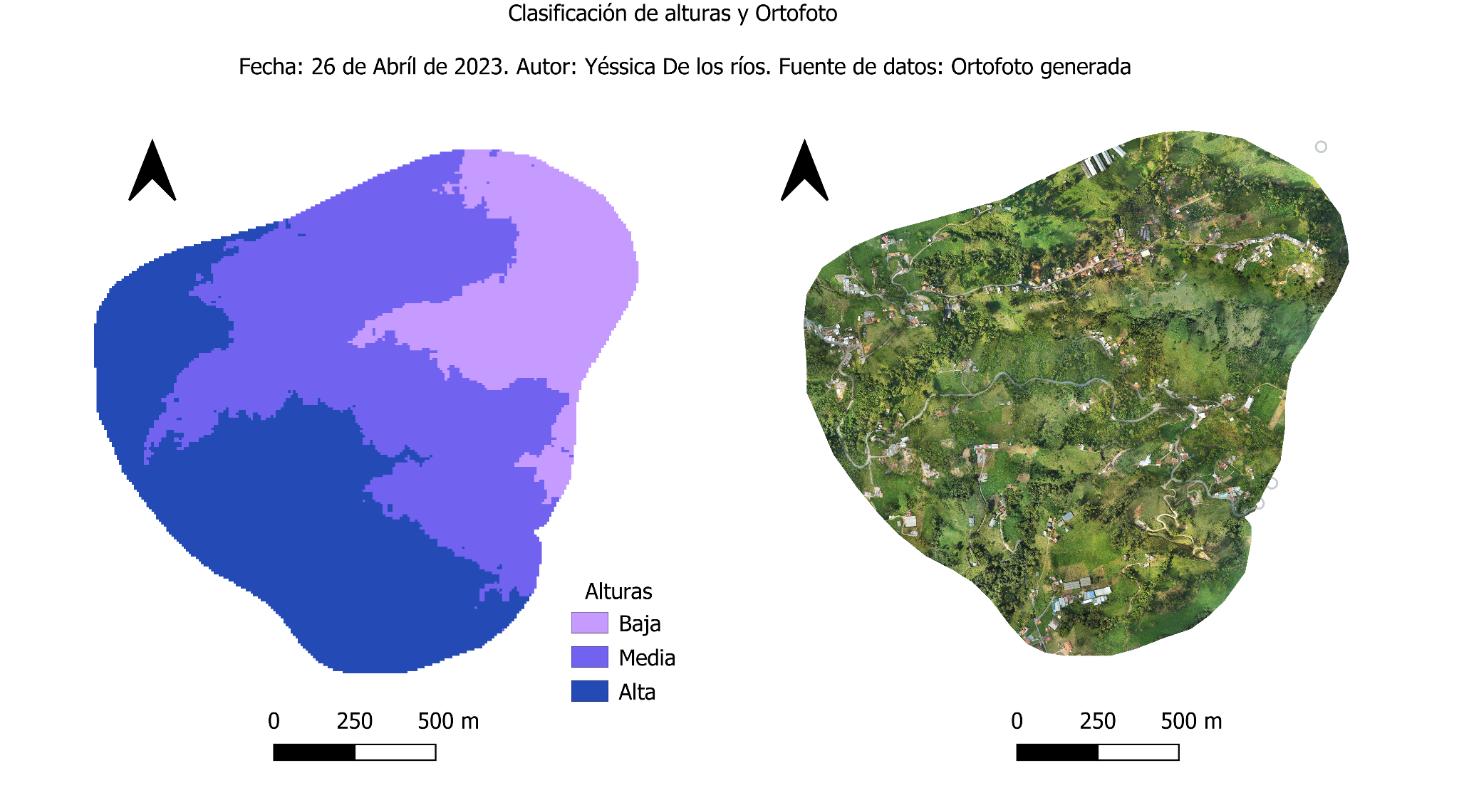 La actualización cartográfica de cuatro veredas en OpenStreetMap (OSM) se llevó a cabo utilizando una imagen digital de Medellín de 2021 [24] y una ortofoto complementaria generada con dron como parte de este proyecto, en noviembre de 2023 [25]. Esta última fue producida para una de las zonas afectadas por deslizamientos, con el objetivo de mejorar la resolución de referencia y establecer una base de observación para monitorear la evolución del área.