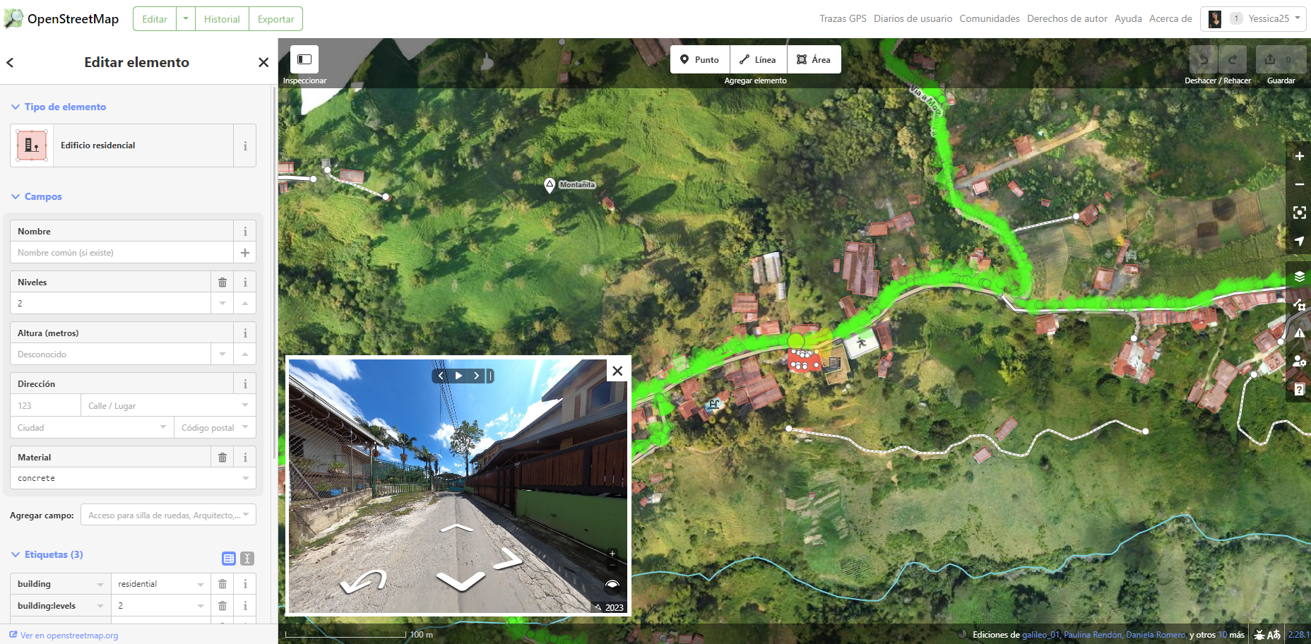 Con la participación de estudiantes de YouthMappers y miembros de VAPES, en apoyo técnico a la comunidad de San Antonio, se mapearon en total 4,286 edificios en las cuatro veredas y 31 kilómetros de vía. Se añadieron atributos a OSM como tipo de edificio (religioso, educativo, comercial, etc), material de construcción (concreto, adobe, madera, entre otros) y número de pisos. Se actualizó también información relacionada con vías y caminos (tipo de camino, tipo de vía, dirección de la vía, superficie y estado).