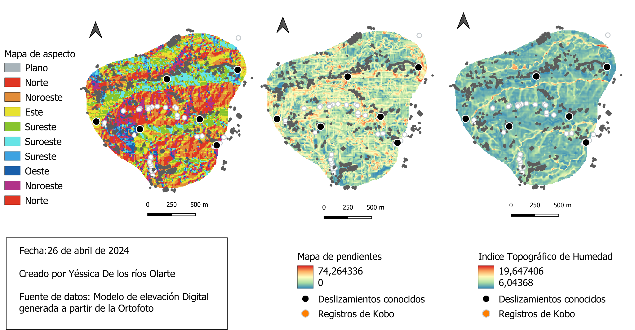 Descargando la información actualizada de OpenStreetMap (OSM) y utilizando las imágenes generadas por dron, se realizaron análisis para visualizar la posición de las veredas mapeadas, los puntos de deslizamientos conocidos y los registros de Kobo, en relación con variables que influyen en los movimientos en masa. Entre estas variables se consideraron la probabilidad de saturación del suelo (índice topográfico de humedad), las pendientes y el aspecto (orientación de las laderas) [30].