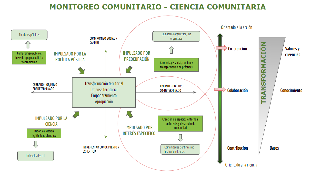 Estos enfoques (impulsados desde la política pública; la ciencia; una preocupación local; o bien un interés específico) se describen y sintetizan en la Figura 1, la cual muestra el grado de colaboración y el potencial de transformación que implica cada modelo de monitoreo comunitario según cómo se concibe y desarrolla.