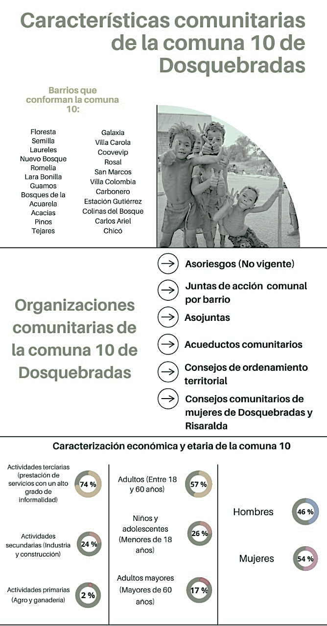 Para realizar la evaluación de los componentes de la resiliencia en la Comuna 10, se realizaron reuniones preliminares con líderes de la Comuna 10, los cuales generaron retroalimentación a las preguntas de la herramienta. Esta reunión se denomina, según la herramienta ARC-D, “Grupo Focal”. Las condiciones comunitarias de la Comuna 10 de Dosquebradas incluyen barrios, organizaciones comunitarias y características económicas (Figura 5).