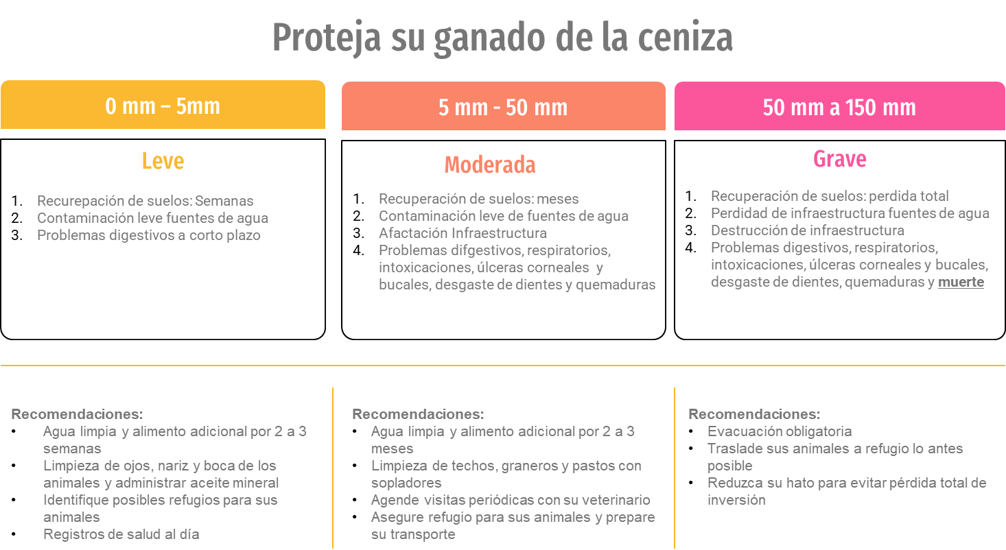 Es importante considerar que las distintas medidas y acciones deben orientarse a la preparación, respuesta y rehabilitación en escenarios de erupciones volcánicas aplicadas a los animales de producción que se vean afectados. Dentro de esas medidas se resaltan las siguientes:
