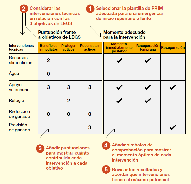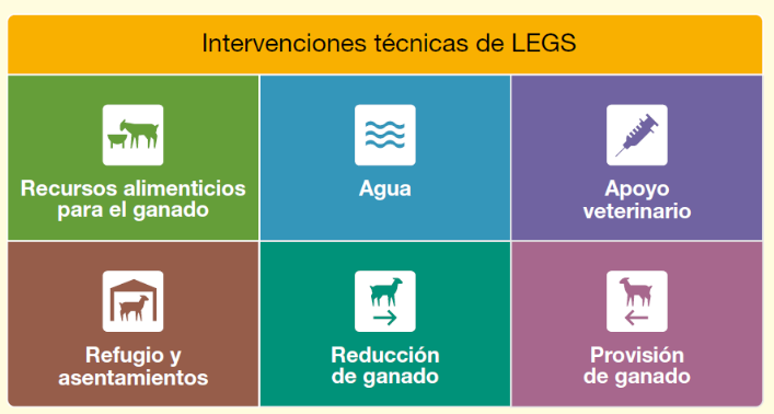 Concienciación sobre la preparación ante desastres para el sector de los animales de granja, a las comunidades y propietarios de animales, manejo de los desastres, rescate técnico de animales, servicios veterinarios, provisión de agua y alimento, asentamientos para animales, reducción de animales y reconstitución de activos ganaderos clave [1].